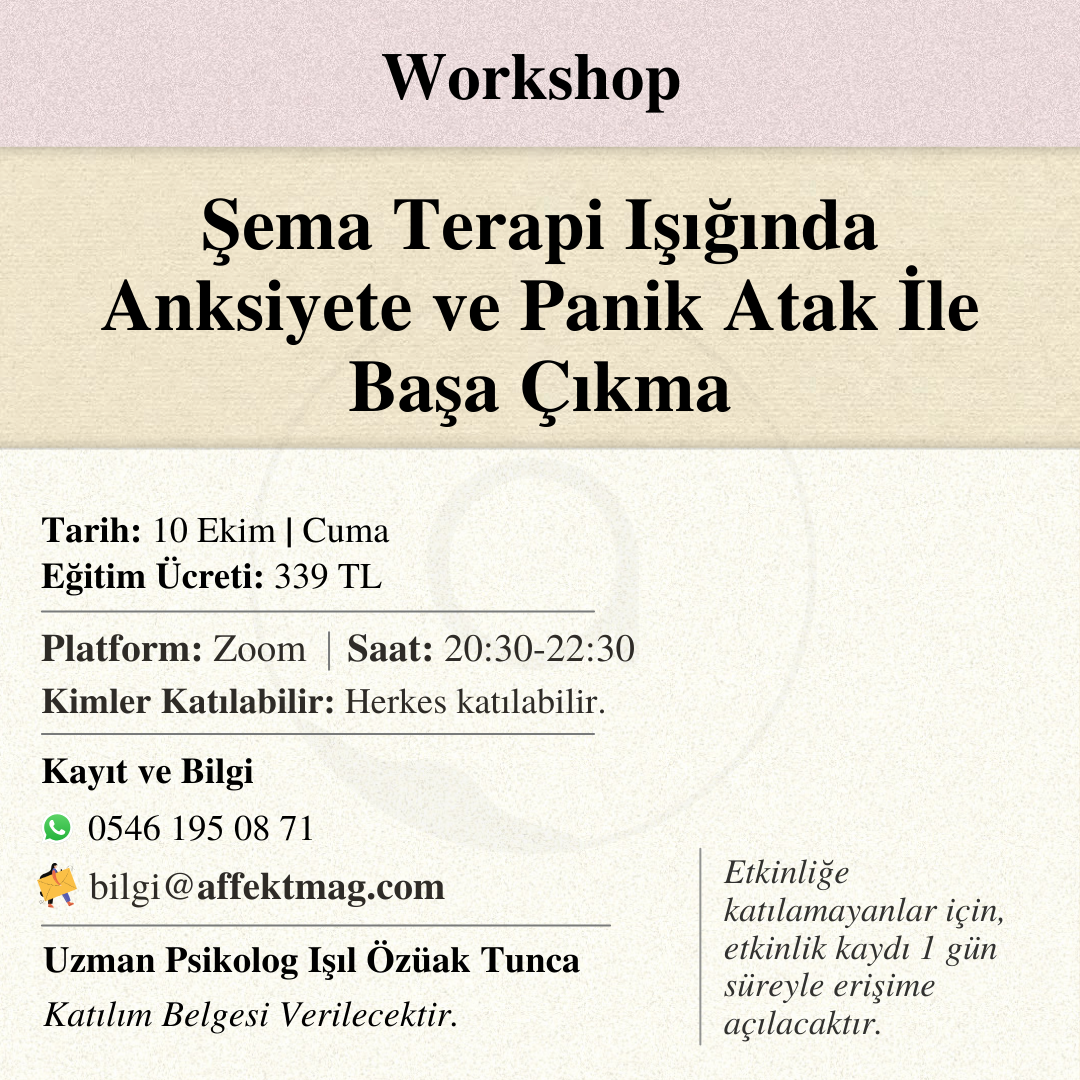 - Şema terapi ışığında anksiyete ile baş etme ve panik atak belirtilerini kontrol etme tekniklerini öğreneceksiniz.