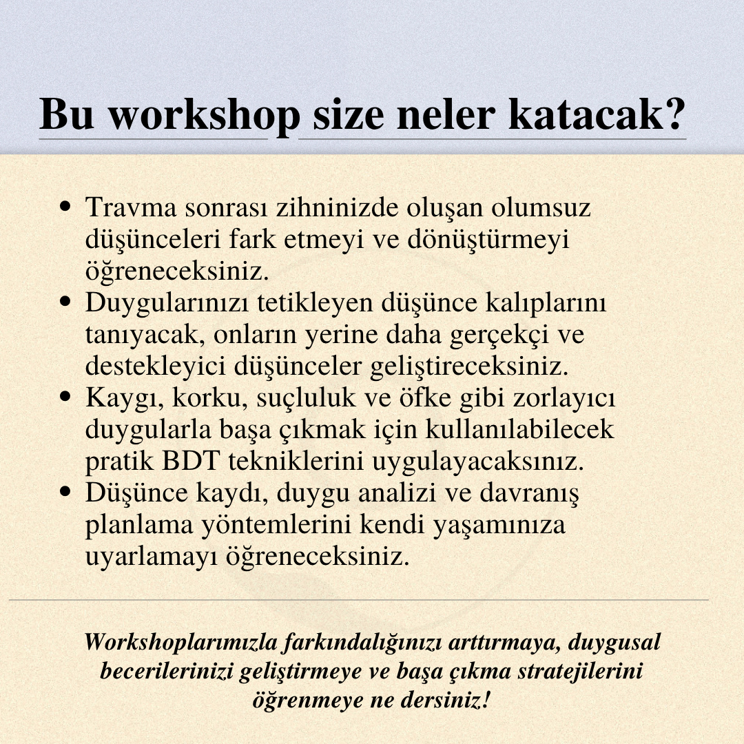- Travma sonrası zihninizde oluşan olumsuz düşünceleri fark etmeyi ve dönüştürmeyi öğreneceksiniz.